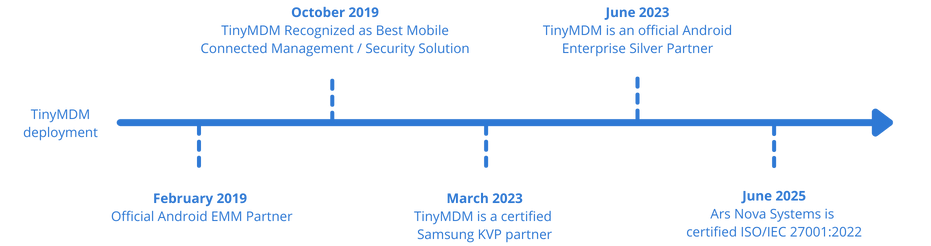 In June 2025, TinyMDM, through Ars Nova Systems, obtained ISO/IEC 27001:2022 certification. This certification is an international standard that specifies the requirements for an Information Security Management System (ISMS). It allows for the evaluation, management, and reduction of risks related to the security of sensitive information, whether personal, financial, or other types of critical data. This standard requires organizations to implement a rigorous set of controls to protect this data against the risks of disclosure, modification, or loss.