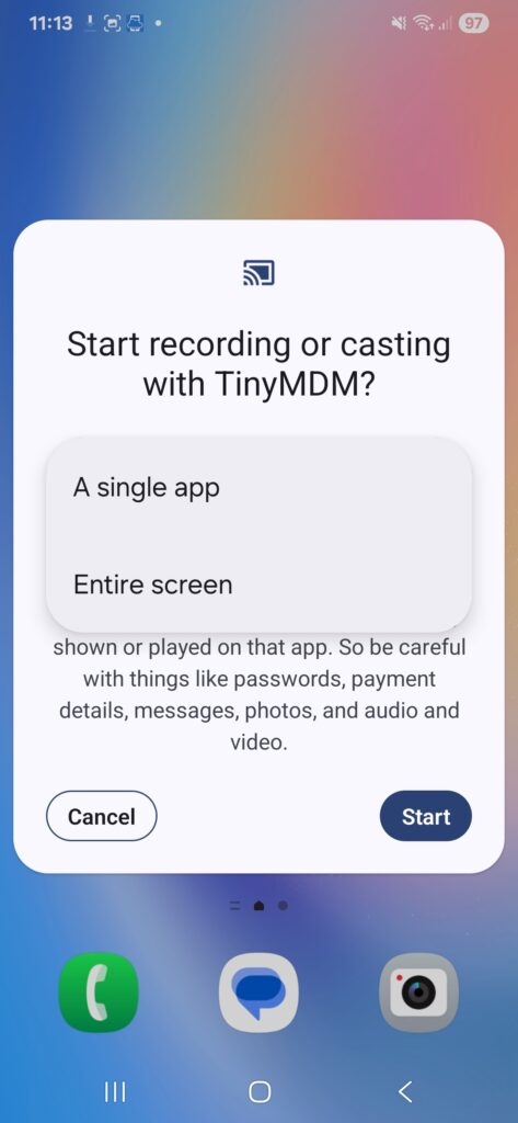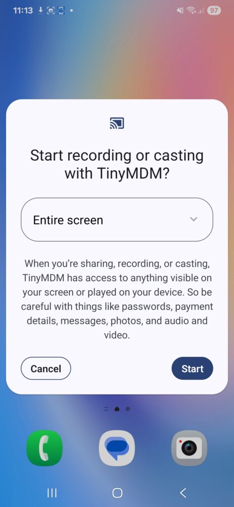 2. On some devices, a second pop-up “Start recording or casting with TinyMDM?” may appear. Unlike the previous one, this pop-up can not be hidden from the policy. The user has to click on Start now to activate the remote view or control session.