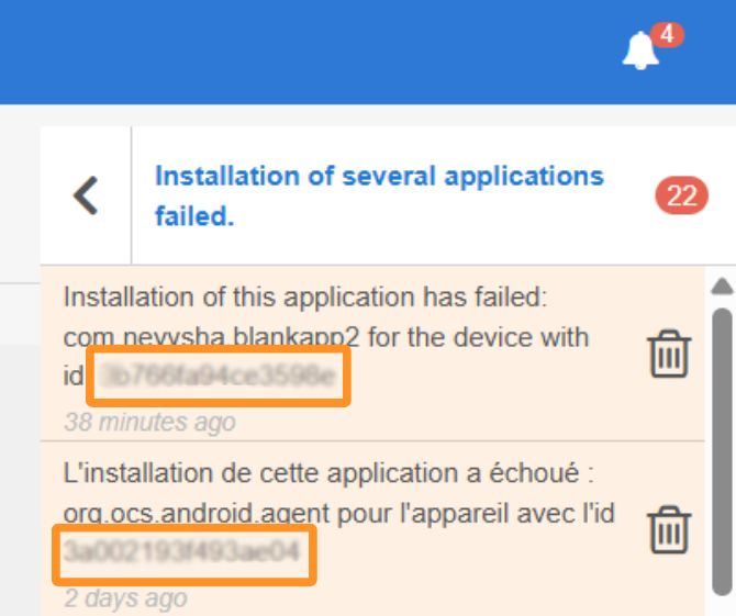 If an error occurs during the installation or update of a TinyMDM Store application, a notification will be displayed in your console. To find the device concerned by the error and understand what triggered it, simply open the notification bell, located at the top right of your administration console: