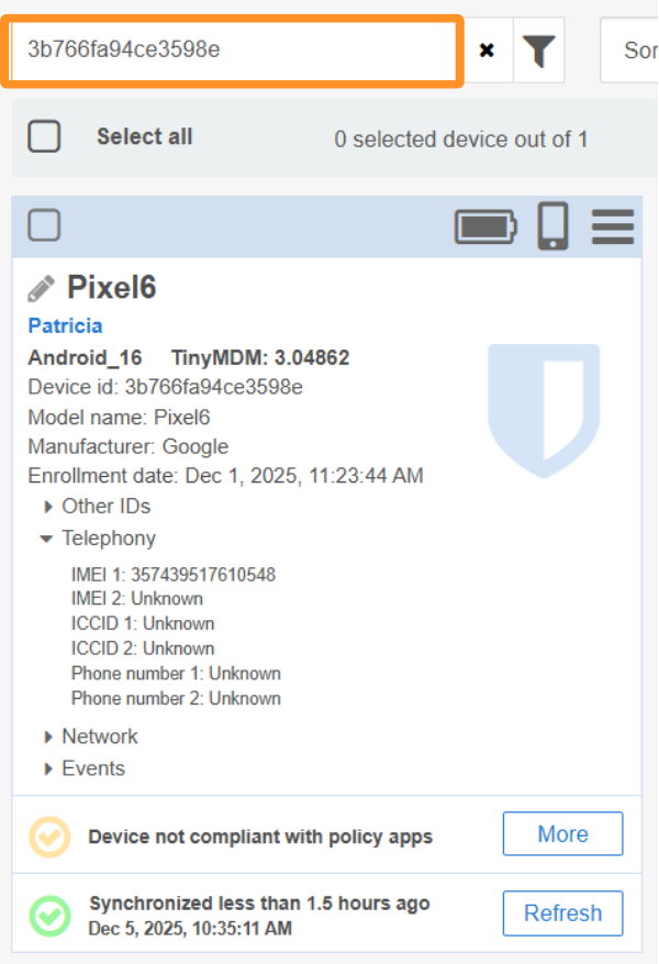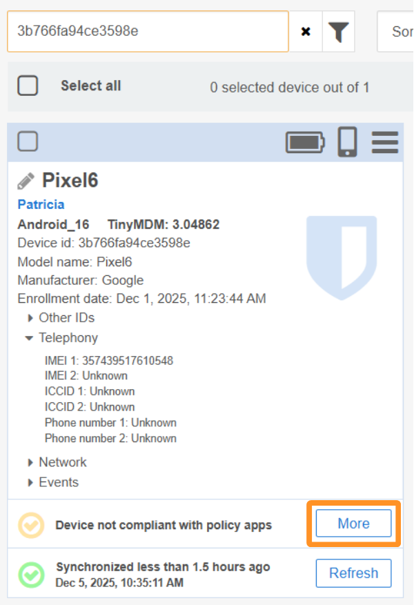 Then open the Devices tab and paste the identifier into the search bar to make the concerned device appear and click on More.
