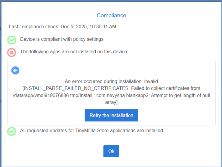 The error below is an error that originates from the device’s Android system, not from TinyMDM. If it is not explicit, feel free to perform a web search to find out its meaning: