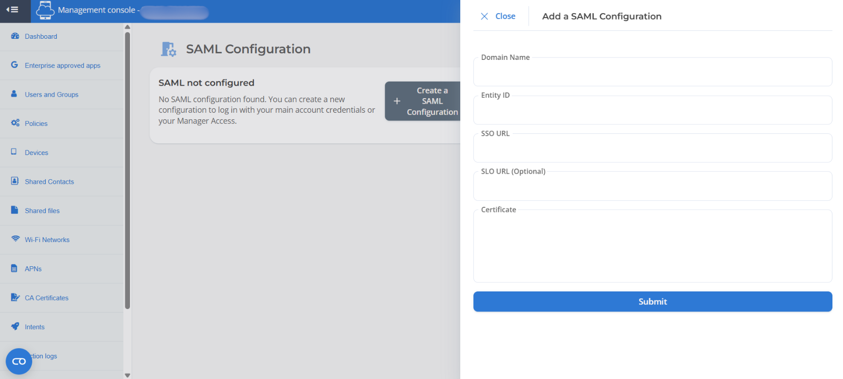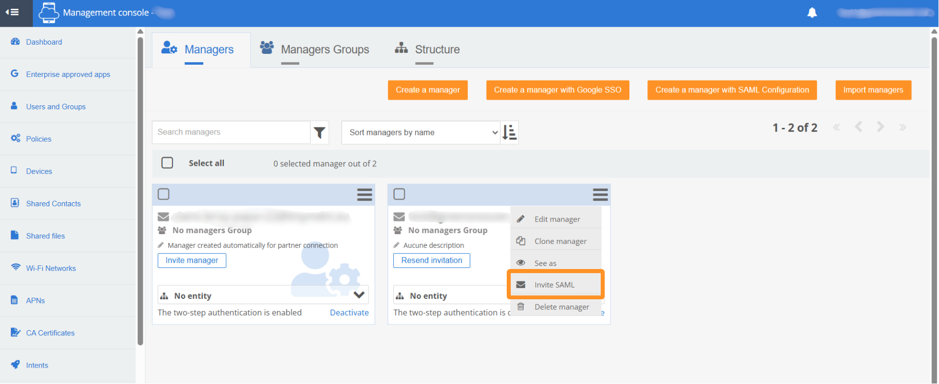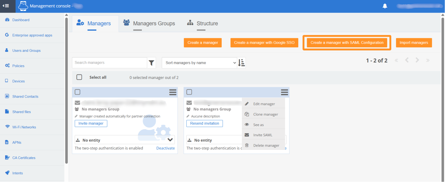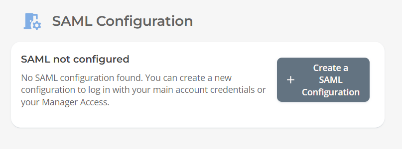 - If you want to configure SAML login for a manager who has not been created yet, you must click on Create a manager with SAML Configuration.