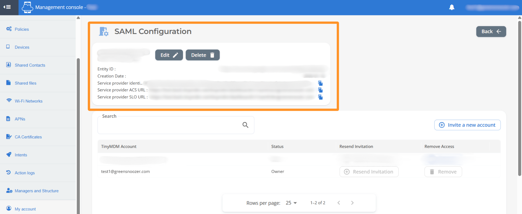 - Once all the info has been entered, click Confirm. Your SAML configuration will then appear on TinyMDM.