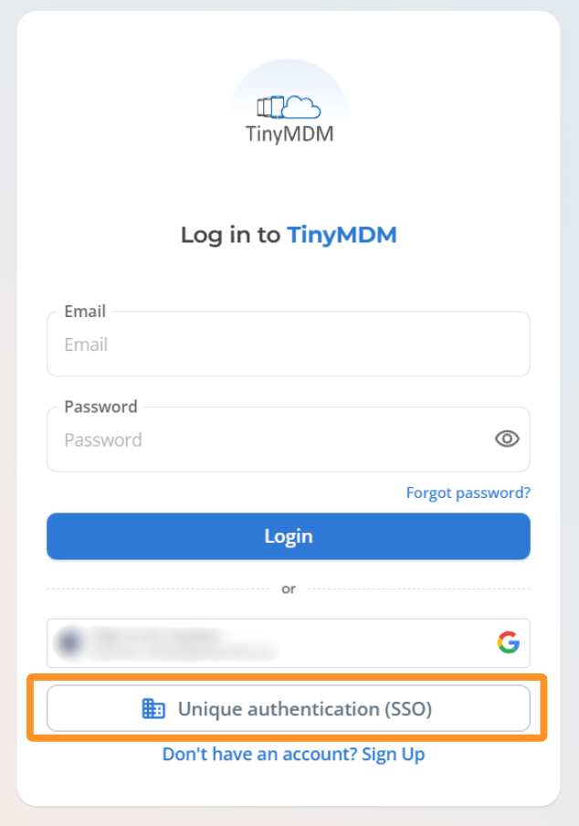 - They will be able to access their TinyMDM account by clicking on Unique authentication (SSO).