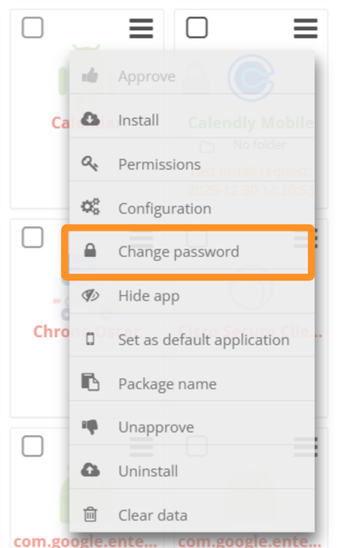 • In the Apps management subtab, click on the icon (at the top right of the application you want to protect) and then click on Change password.