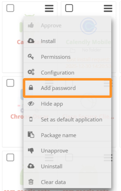 • In the Apps management subtab, click on the icon (at the top right of the application you want to protect) and then click on Add password.