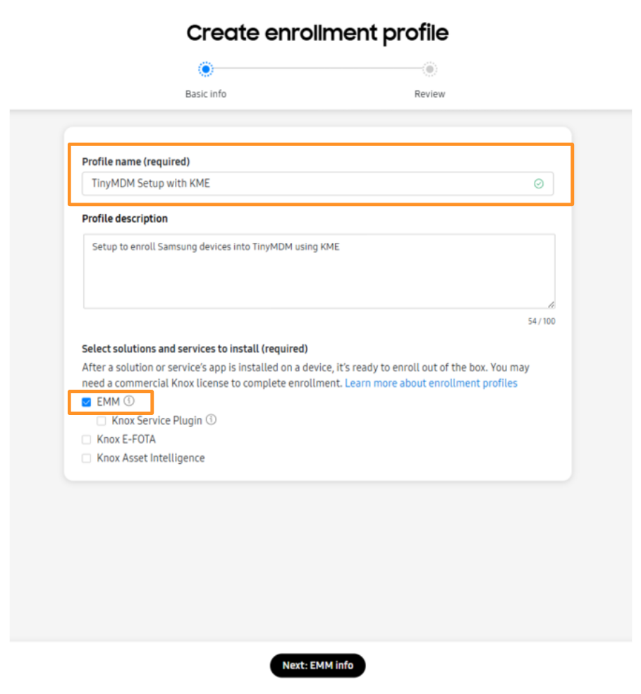 - Enter your MDM profile name and your company information in the description. Next, under Select solutions and services to install (required), check EMM and then click the Next: EMM Info button.