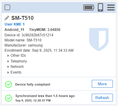 “Knox Mobile Enrollment” is a simplified enrollment process for Samsung devices. On first start-up, the devices check whether they have a specific configuration. If so, the fully managed device configuration process is launched, the right MDM is downloaded (here TinyMDM) and the device configuration is completed.